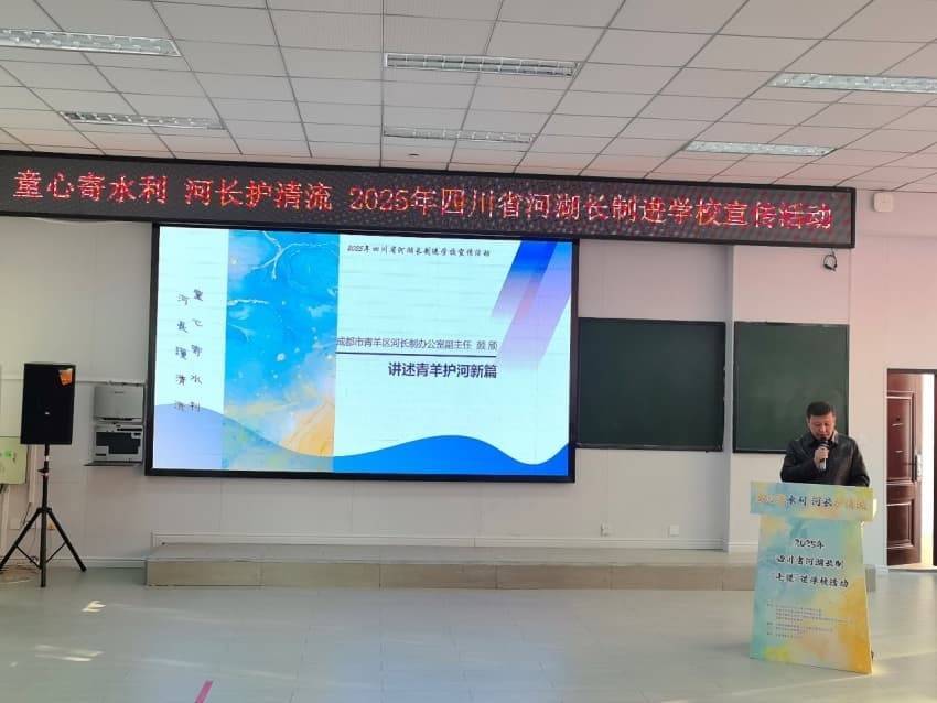 青羊区民间河长代表走上台,用通俗易懂的语言为同学们讲解河长制的定义和工作内容。不仅介绍了河长的职责,还分享了如何在家庭中开展节水护水的小窍门。